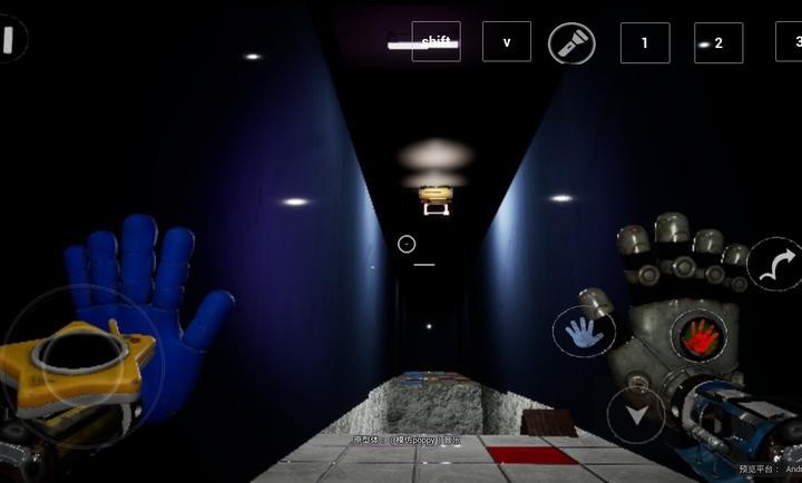 6、开门之后走里面还会有一个开关给他拉下来,往前走进去用蓝色手臂互动一下前面的开关,这里要触发三个开关才能有电流打通出口;