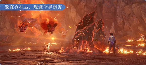 猩红神兽召唤陨石时,要留心脚下红圈 ,注意躲避。当它施放全屏攻击时,场上的石柱将会成为你的掩体!