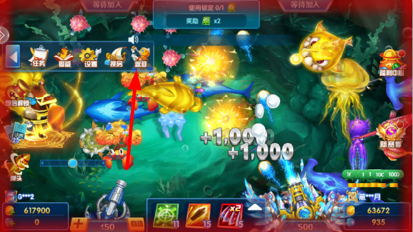 3 、进入到捕鱼界面,我们就需要点击屏幕来捕捉鱼类 ,如果觉得捕鱼效率太低的话,也可以点击中央的道具来助阵,点击“+”来升级我们的炮塔 ,越大的炮塔捕鱼效率越高哦 。