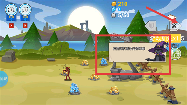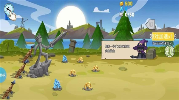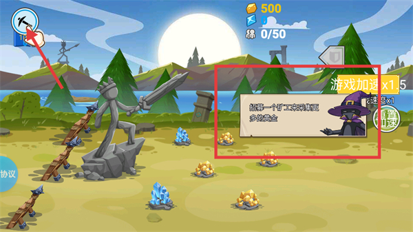 2 、进入关卡后,根据界面提示点击矿工图标 ,招募矿工来采集更多的黄金资源。