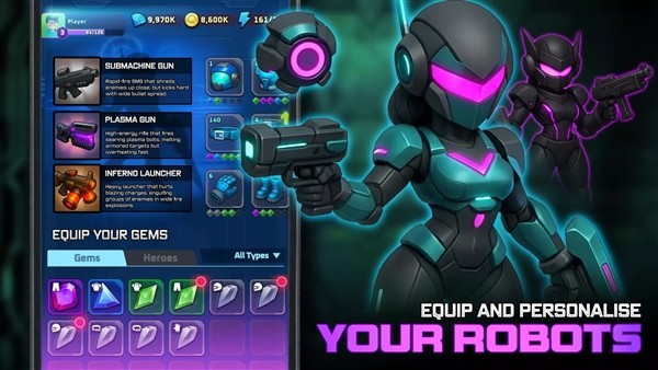 1.组建专属机器人防御小队 ,解锁拥有独特技能的英雄机器人,打造个性化防御阵容 。