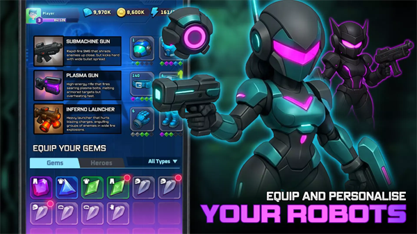 4.解锁并升级多种不同战斗风格的机器人,每种机器人都有专属玩法,丰富体验维度。