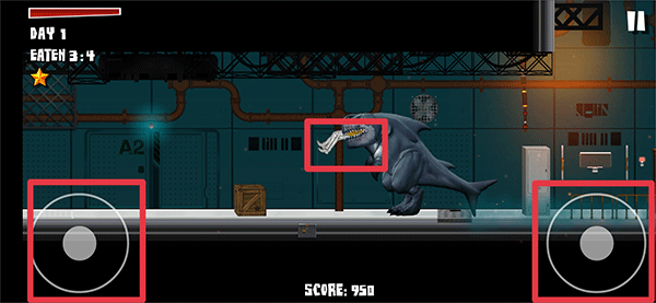3、左边按钮上滑为跳跃 、下滑为蹲下 ,然后通过左边按钮左右滑动控制鲨鱼前进,并点击右边按钮吃掉途中出现的人类。