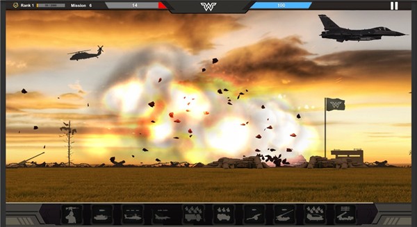 2、 视听沉浸:采用简洁明快的2D画风配合震撼音效,清晰呈现爆炸、冲锋与空袭场面,营造紧张激烈的战争氛围,增强代入感。