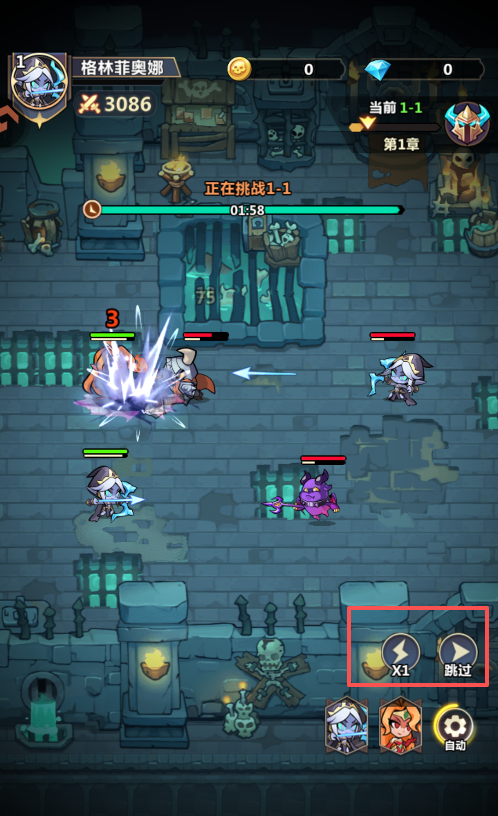 2、在游戏的战斗过程中,玩家可以通过滑动屏幕来移动整个队伍位置,可以用于躲避敌人的大招,此外,玩家可以点击屏幕右下角的图标加快战斗过程或者直接跳过战斗。