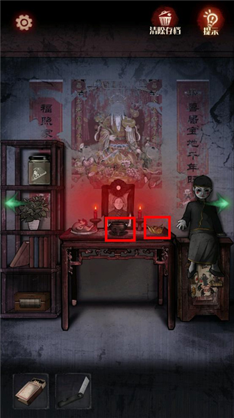 3、向右移动至灵位场景,拿走桌子上的【纸元宝】,移动香炉 ,获得【生锈的钥匙】,将【纸元宝】交给纸人,使纸人离开。