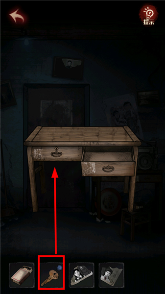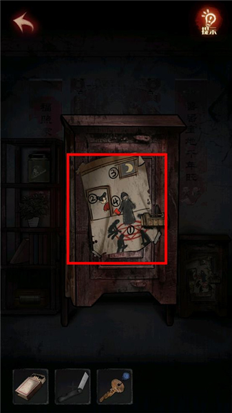 4、查看纸人下面的柜子 ,记住上面的图案:1阵图,2小女孩,3月亮 ,4书,根据这些线索打开上面的锁,获得【旧衣服】和【暗红钥匙】。