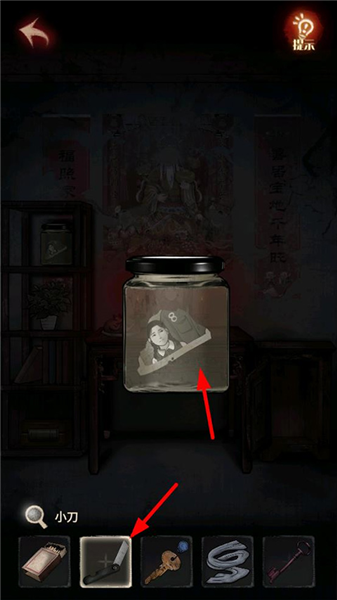 5 、点击左边货架最上面的玻璃罐,使用【小刀】打开 ,获得【碎照片3】。