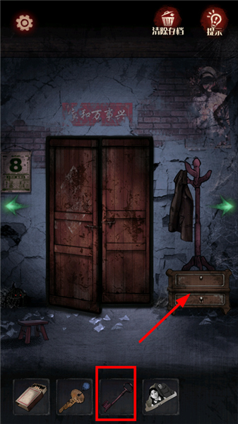 7、向右回到大门口,点击衣架下面的抽屉 ,使用【暗红钥匙】打开,获得【馒头】。