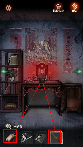 10、向右来到灵位处,将【一把香】插入香炉 ,使用【火柴】点燃,在燃烧的烟雾中看到数字:583。