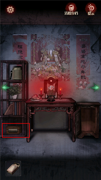 13、向右来到灵位场景,点击左边货架下面的箱子 ,输入密码5863,打开箱子,获得【卧房钥匙】。