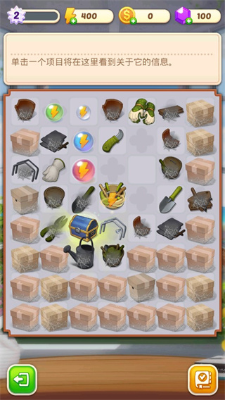 1、首先大家打开游戏可以看到庄园很乱,所以我们要开始整理,点击中间打钩的按钮。