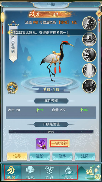 每个坐骑都有自己的技能,给坐骑升级解锁和升级技能能大幅度提高坐骑的战斗力。