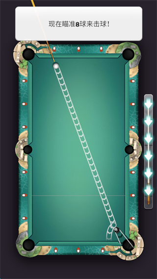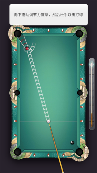 2、白球击打轨迹会显示被击打球的大致滚动方向,通过向下滑动屏幕右下角的“进度条”控制击打力度。
