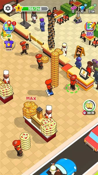 3、社交互动+成就共享,共建披萨王国:支持绑定社交账号,一键分享经营成就、店铺规模、爆款披萨等高光时刻,邀请好友同台竞技、互相助力;还能与好友联动经营,交流经营技巧,携手打造属于彼此的顶流披萨商业帝国,增添社交趣味性。