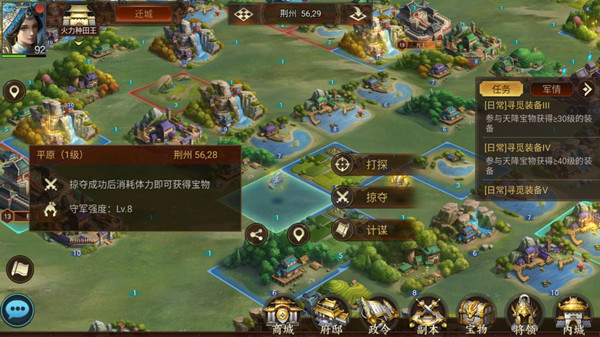 野外获取:每天会有3个装备获取的日常任务,由于获取装备会消耗较多的君主体力,日常任务不仅能提示哪里有装备,还可以返还部分将领体力,前期需要大量练将领(刷绿林或者刷野地)都需要耗费君主体力,所以前期野外获取就拿到3个日常任务的就好了