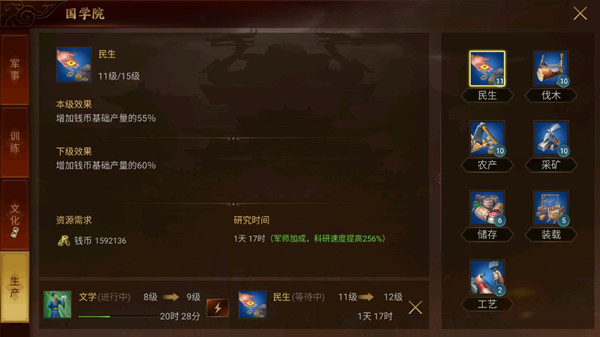 (4)文化和训练:前期影响较小,推荐后期用作练将的科技,当然如果比较喜欢打架,推荐点高一些侦查。
