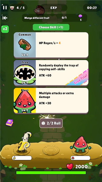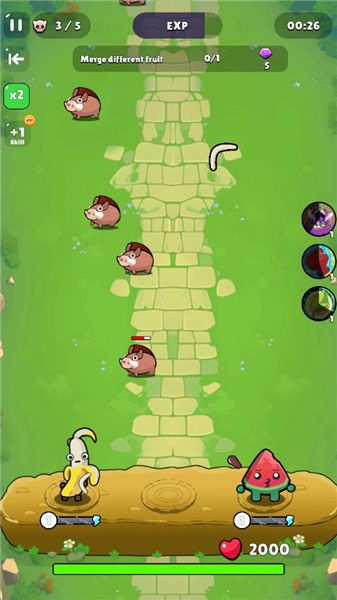 2、 植物英雄:西瓜、香蕉 、牛油果等水果化身战士,拥有独特的元素属性与战斗技能。它们不再是普通作物,而是能够释放强力法术、抵御外敌的英雄角色 ,共同守护家园安宁。
