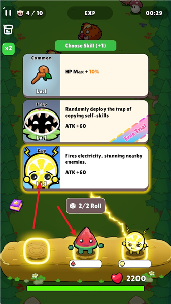 2、 三选升级:每次击败敌人获得经验后 ,玩家可从三种奖励中任选其一,包括新植物英雄、特殊技能或强力武器 。这种随机性让每局成长路径独一无二,充满变数与乐趣。