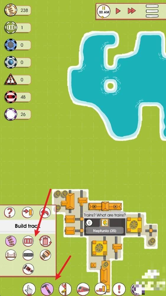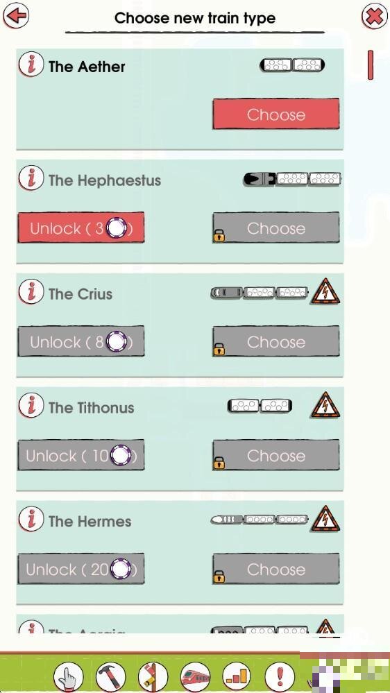 1、进入游戏后,点击下方的锤子图案 ,在这里可以选择各种铁路进行建设。