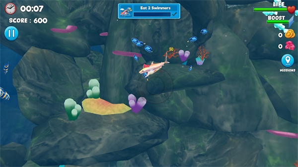 3、超大开放式游戏地图,操控鲨鱼穿梭多样海域风景,自由探索捕食 。